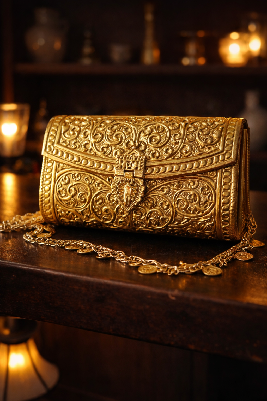 This exquisite 7 x 4 inch handcrafted gold-finish pouch is inspired by the grandeur of traditional Indian heirloom jewelry. Featuring intricate embossed detailing and a beautifully sculpted arched metal handle, this statement piece blends timeless craftsmanship with modern luxury.