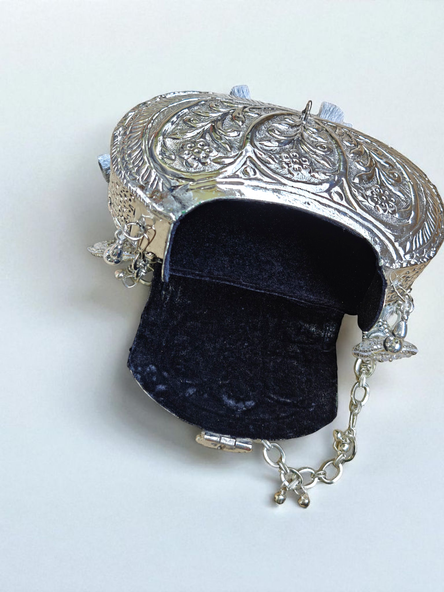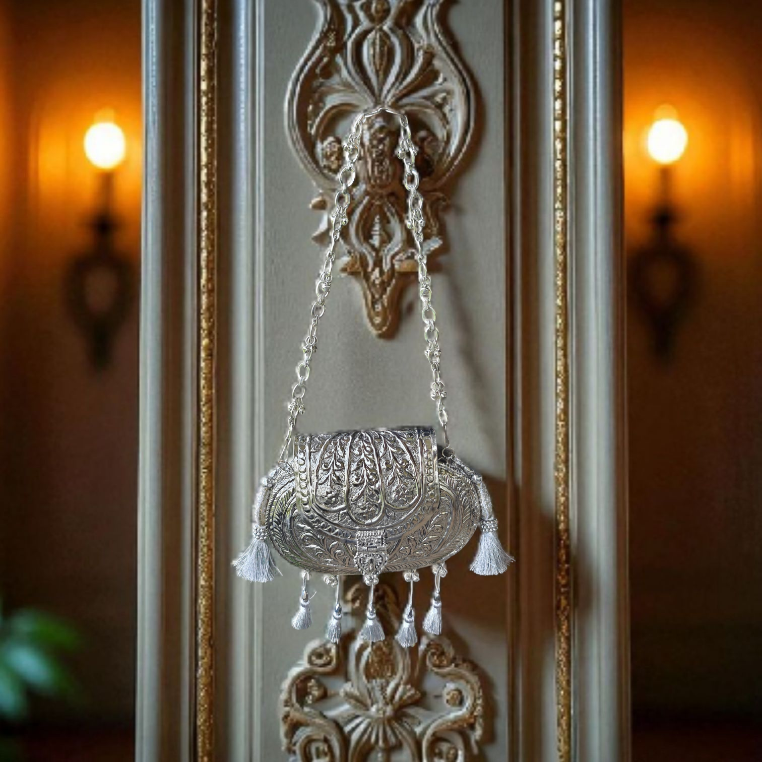 Oval Ethnic Handbag in Silver shade, tassels and ornate ghungroo sling chain