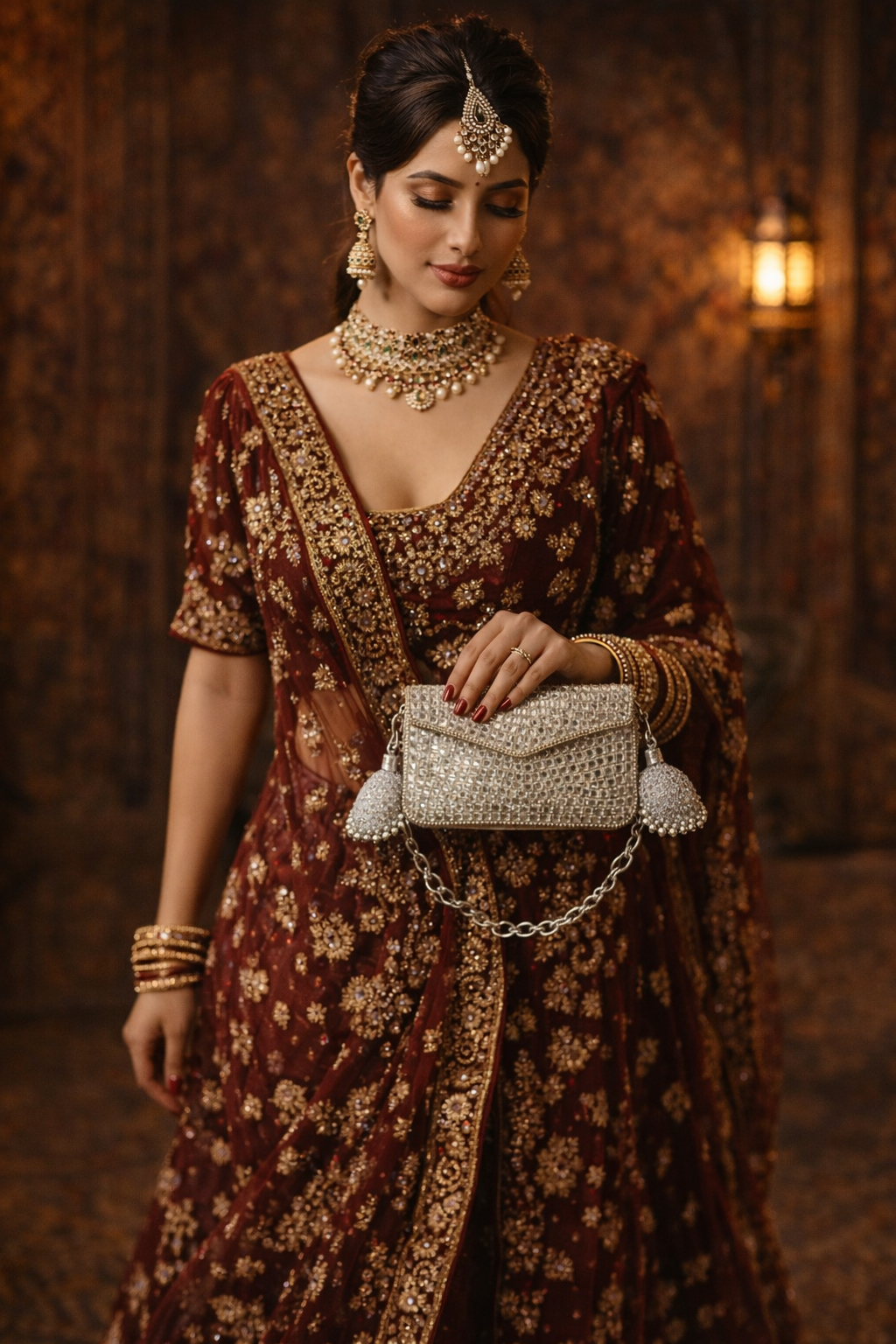 Perfectly sized for essentials, this clutch transitions effortlessly from weddings to festive evenings and celebratory gatherings.