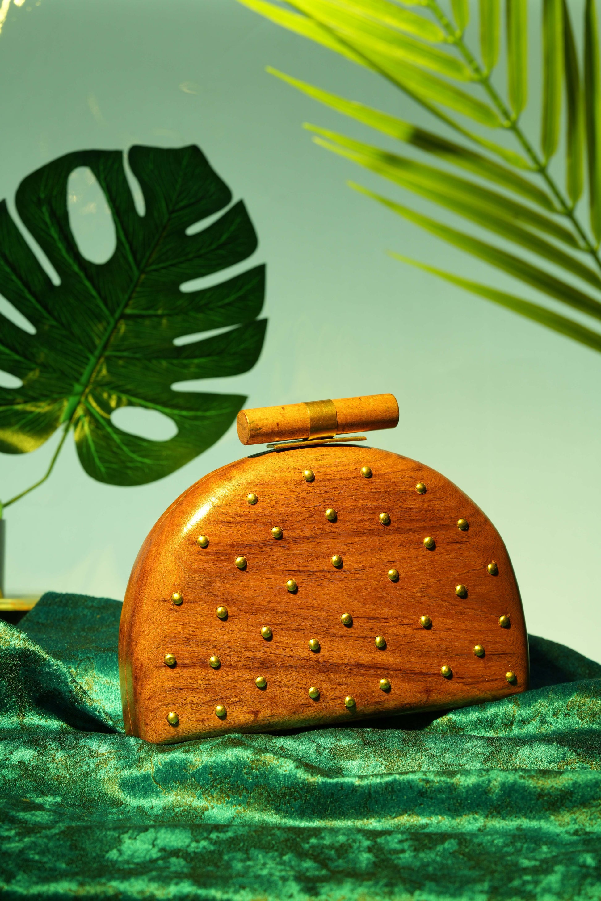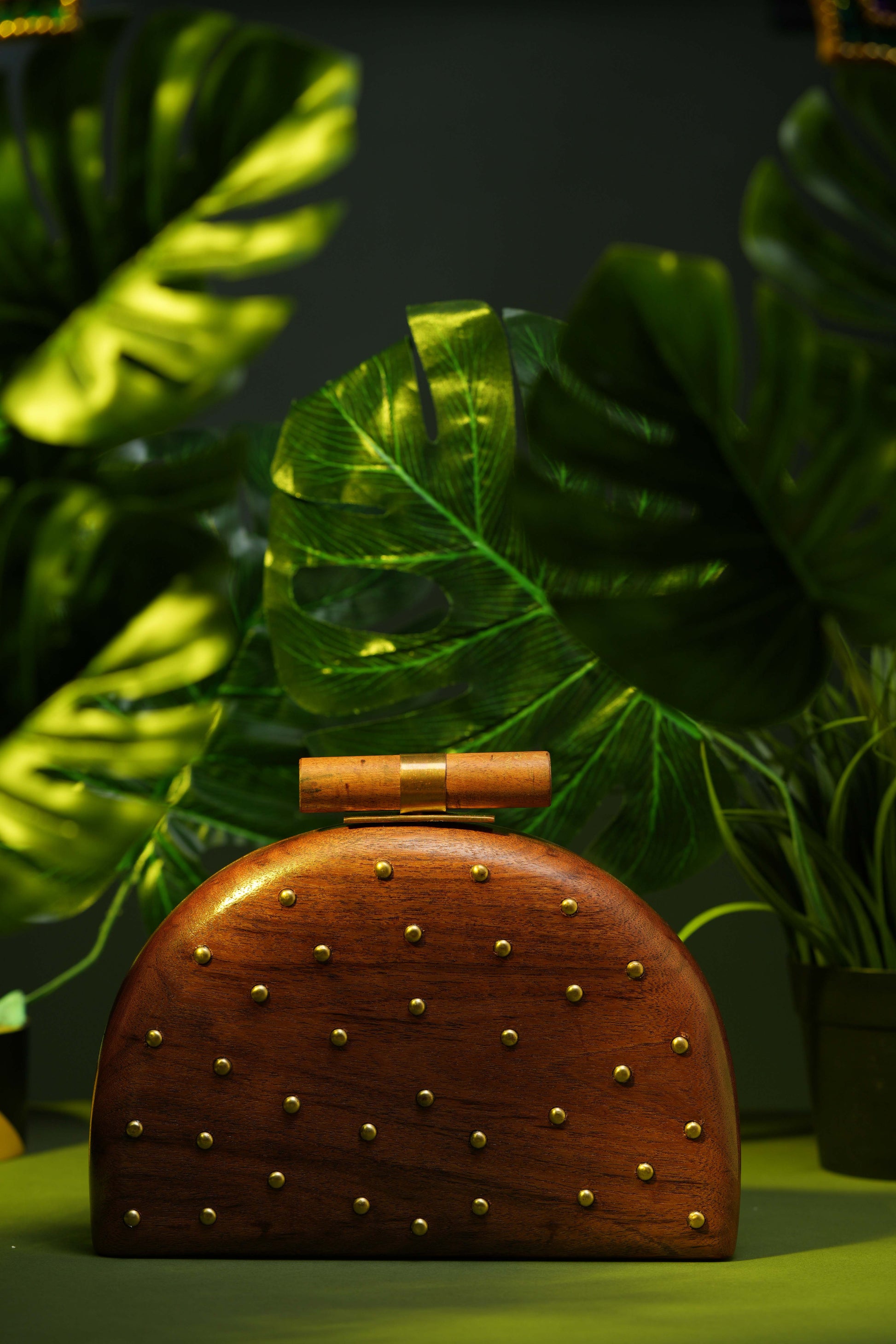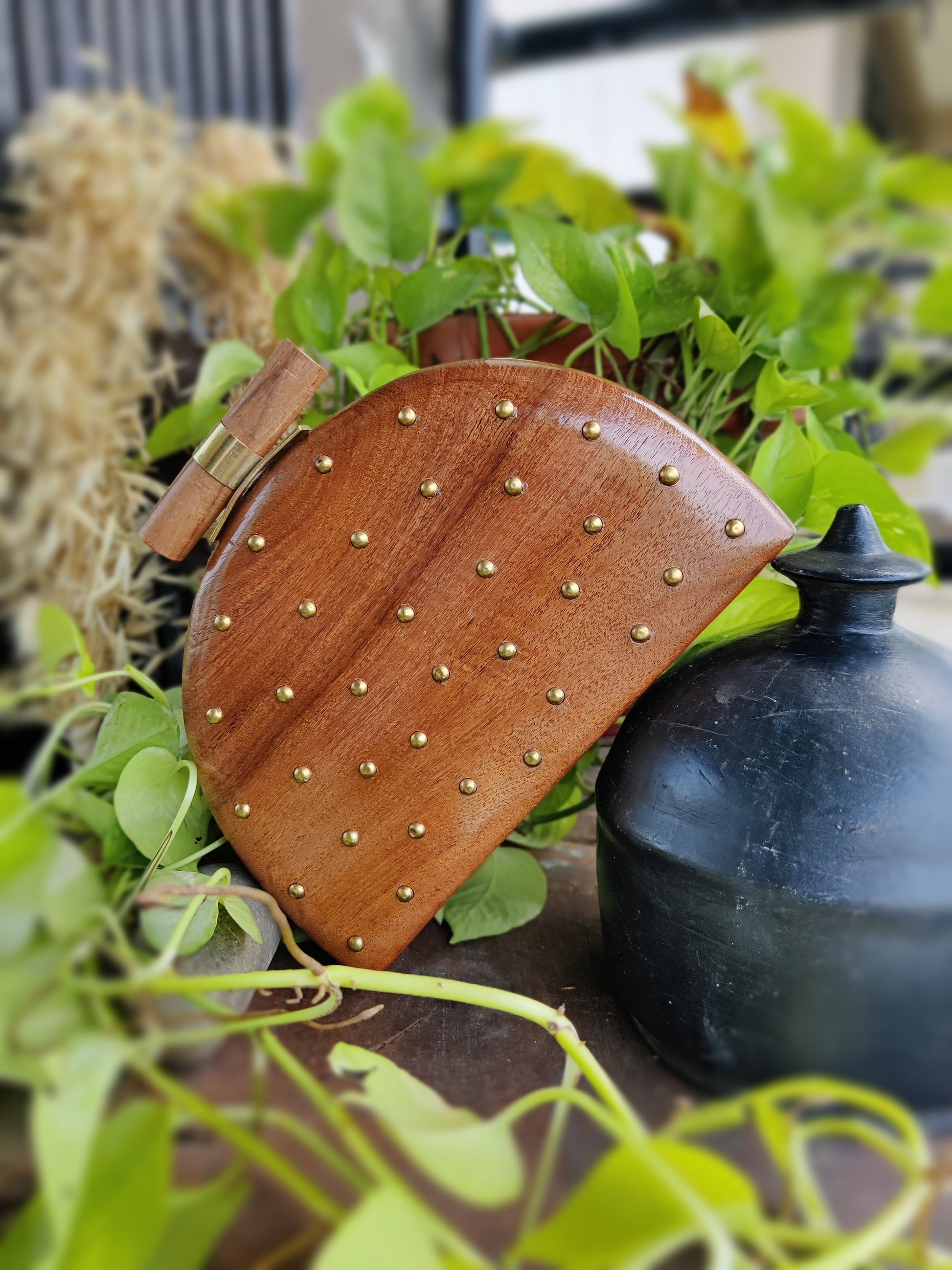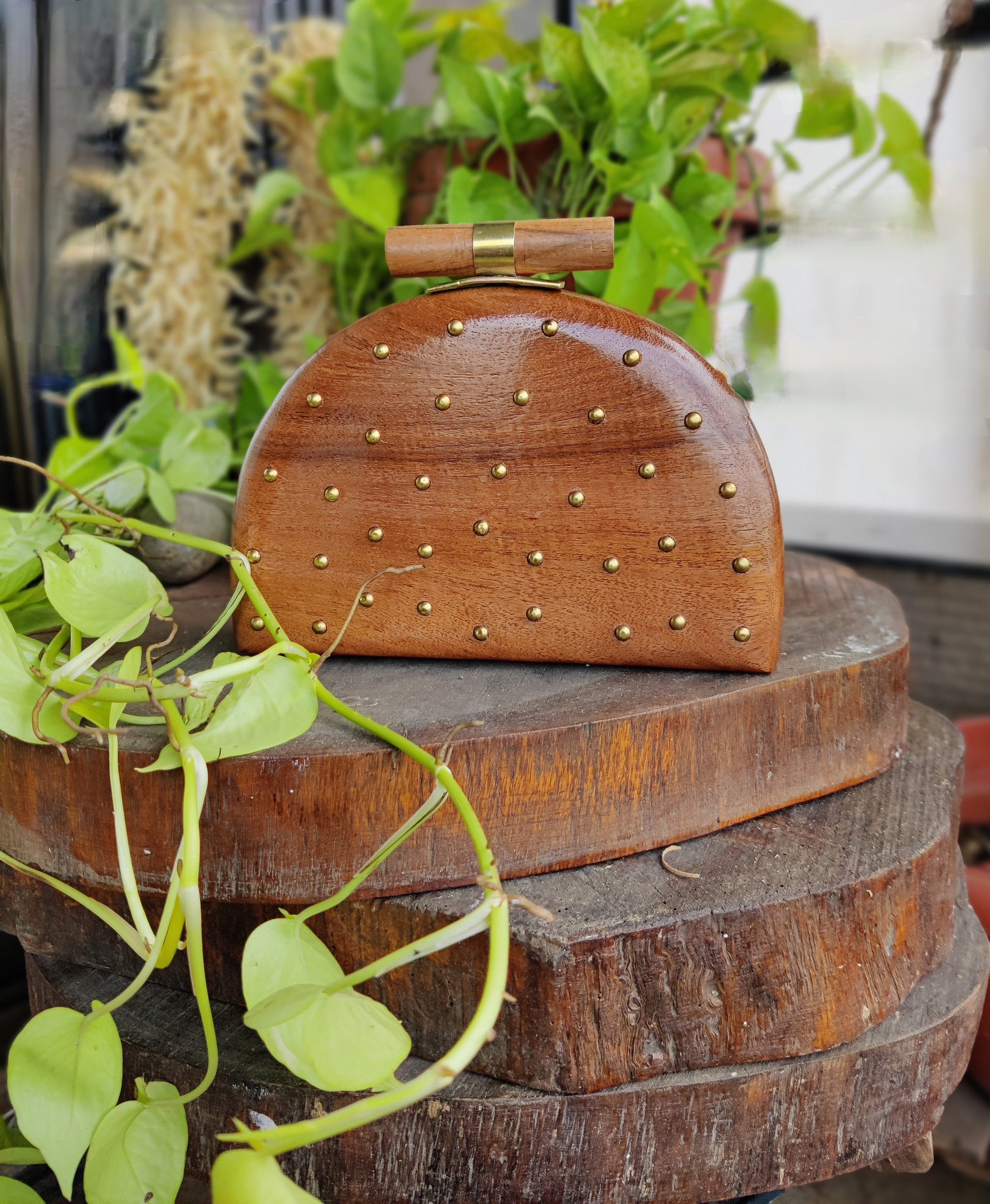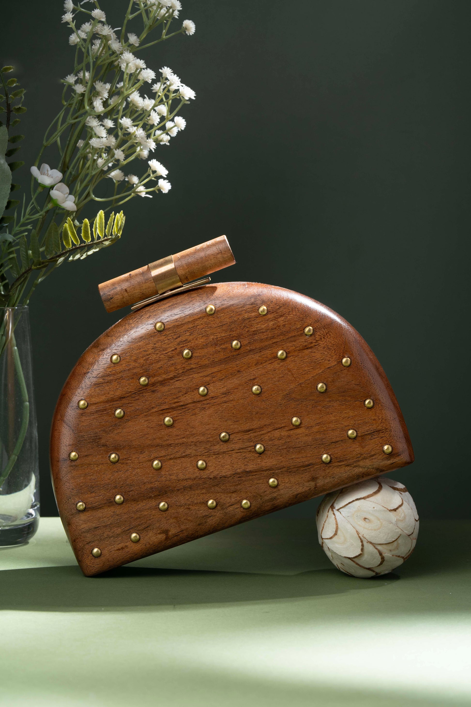Semicircular handbag crafted from acacia wood, embellished with brass studs on the front for an opulent appearance.