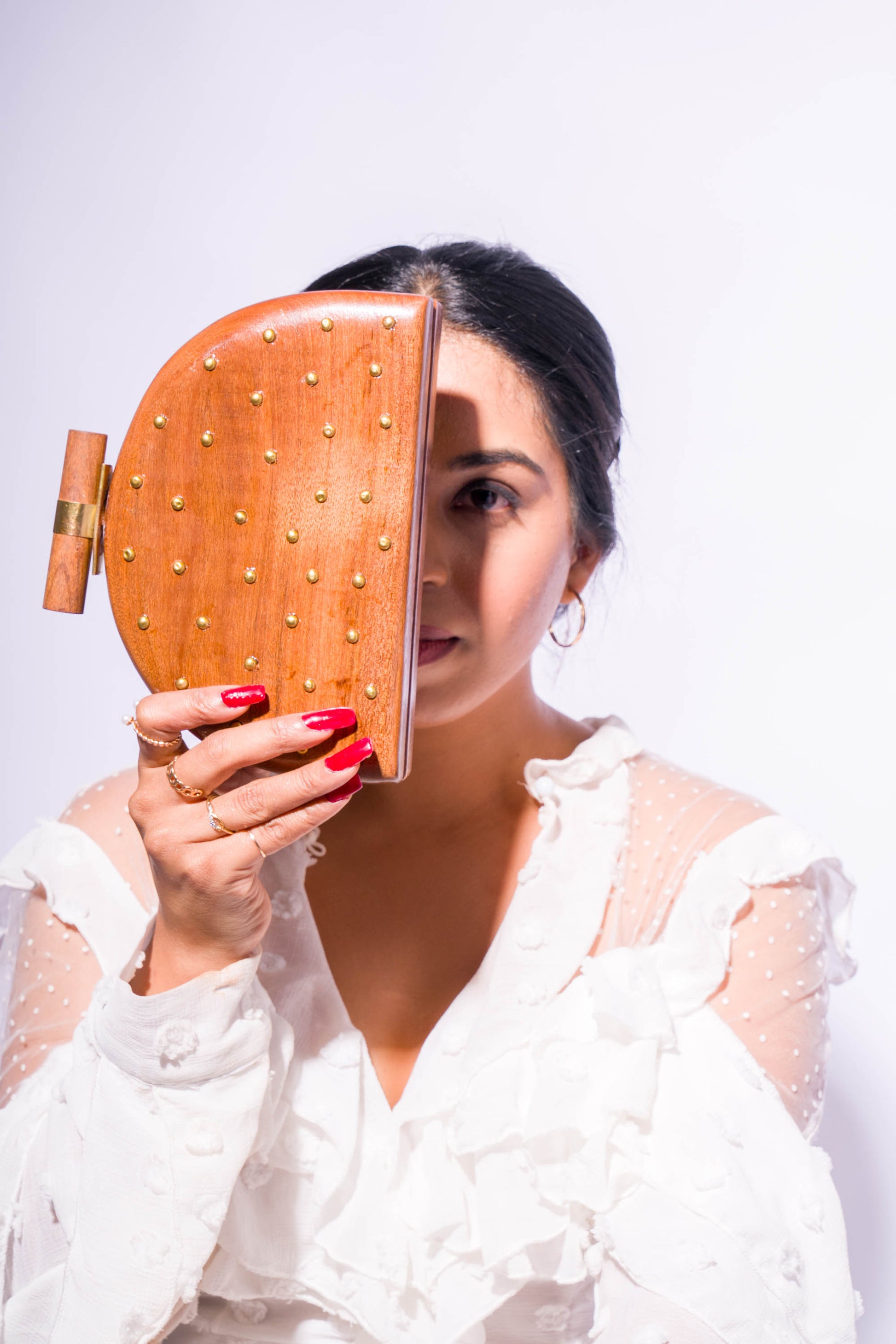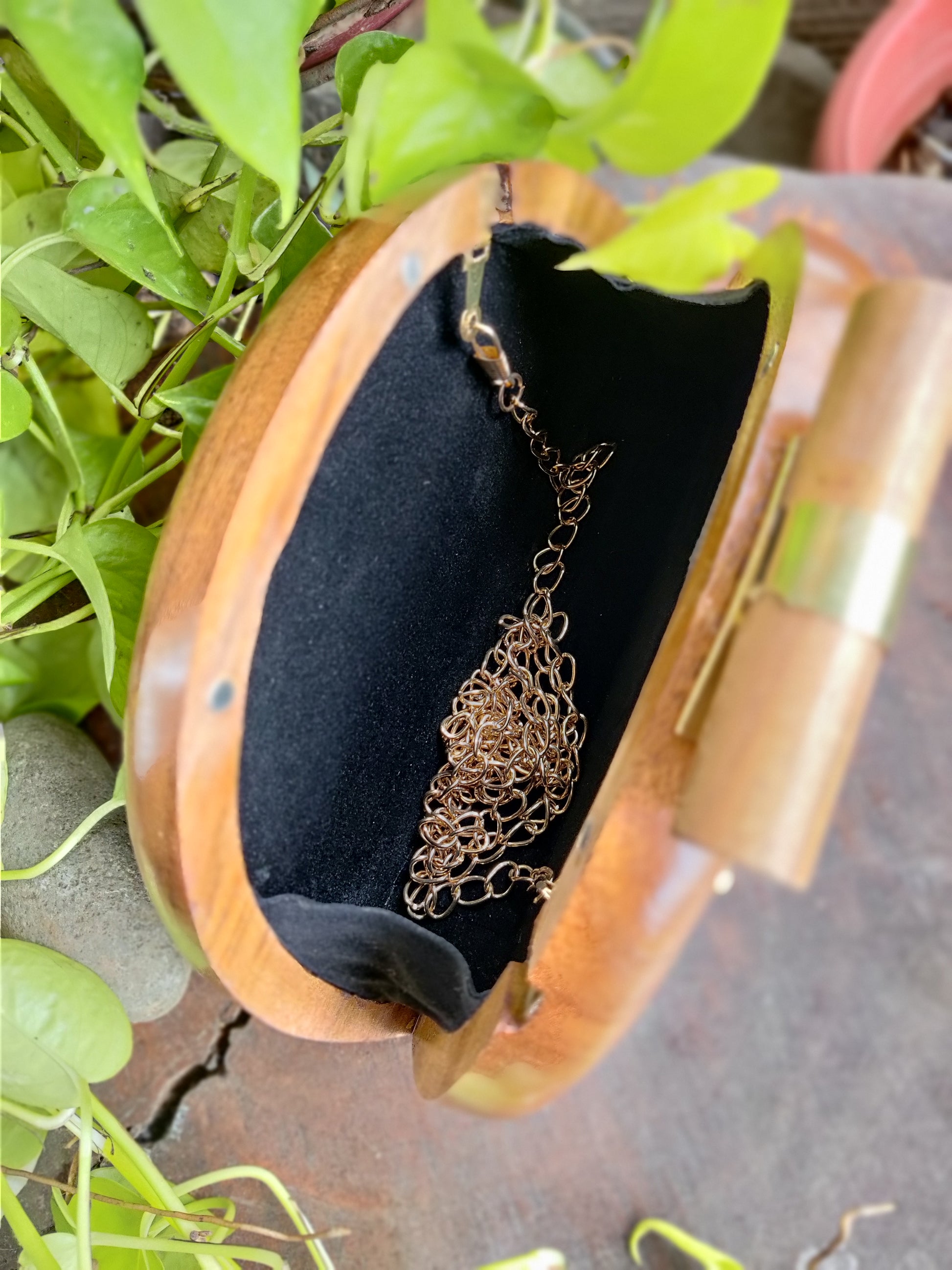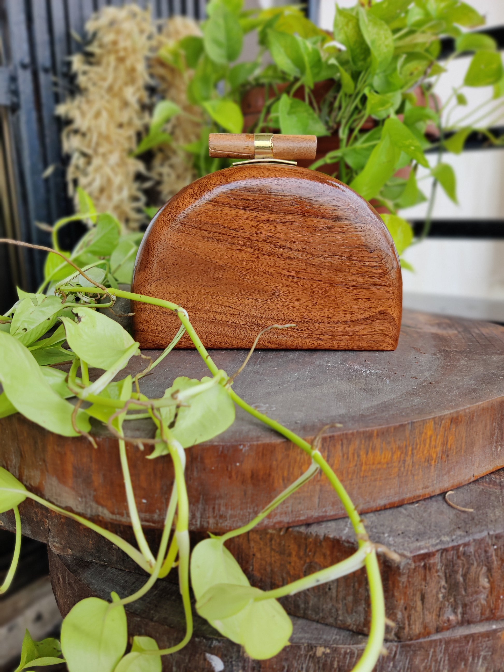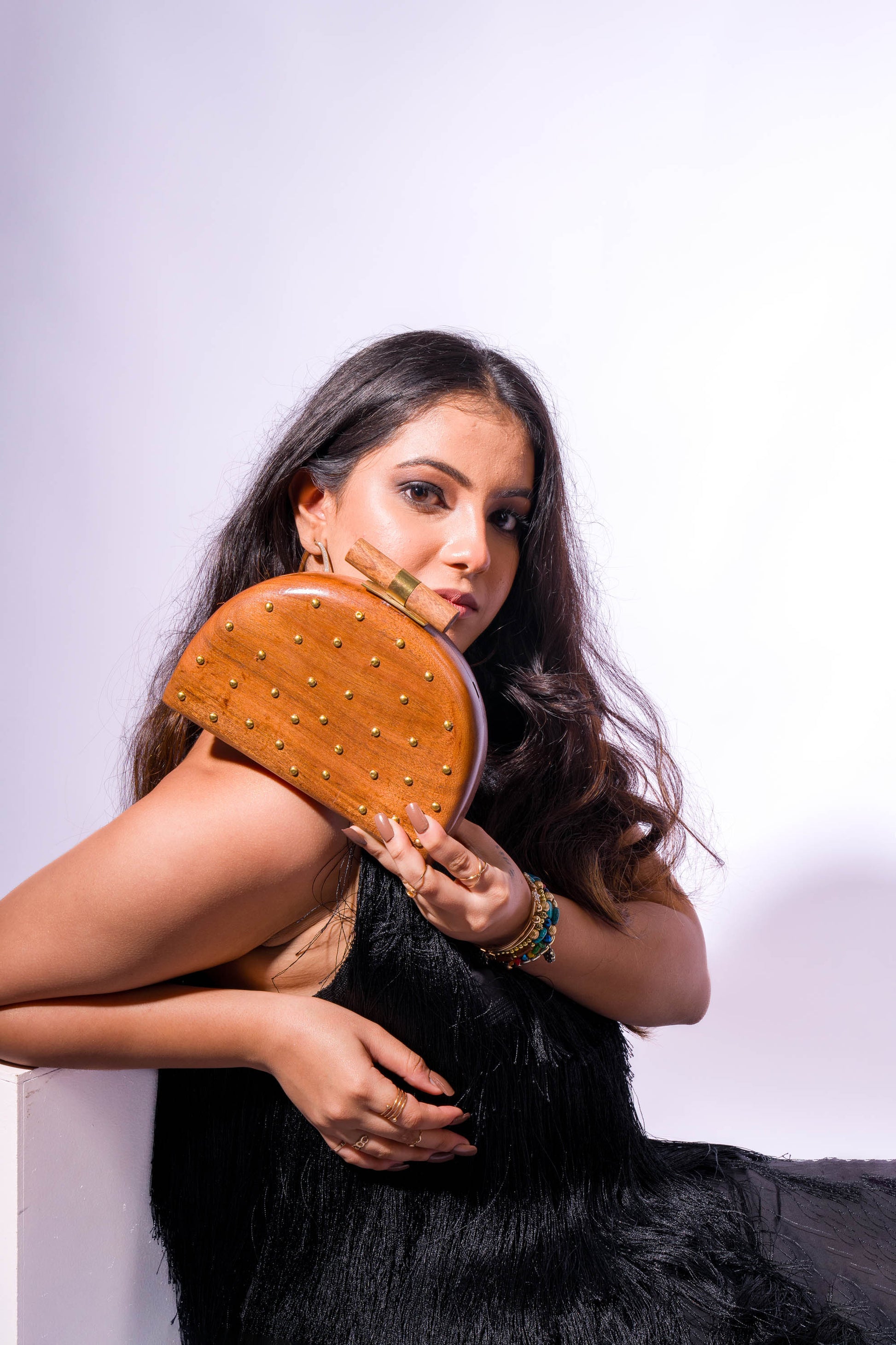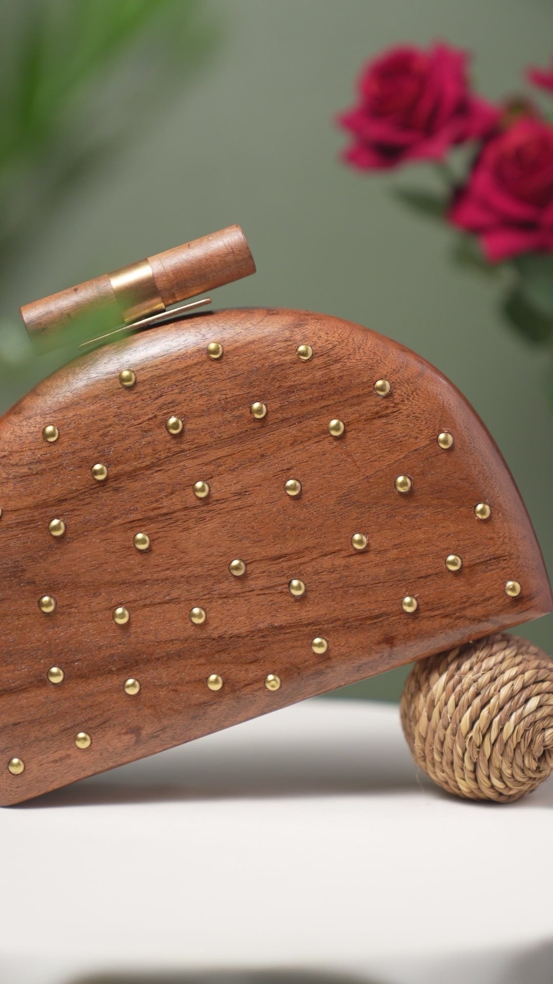 Semicircular handbag crafted from acacia wood, embellished with brass studs on the front for an opulent appearance.