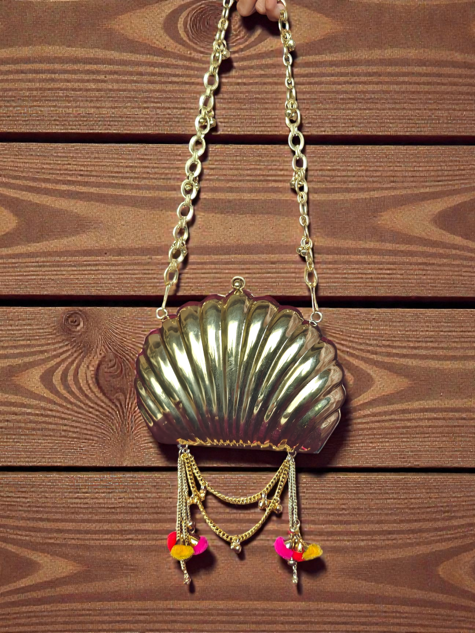 Inspired by timeless Indian opulence, the Golden Shell Heritage Clutch is a statement piece designed for those who love to carry art in their hands. Sculpted in a graceful shell silhouette with a radiant gold finish, this clutch evokes royal charm and vintage luxury, making it perfect for festive evenings, weddings, and glamorous celebrations.